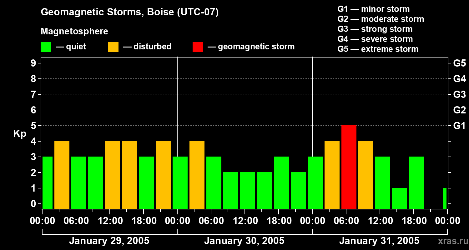Changes in the geomagnetic index Kp from January 29 to 31, 2005 for mid latitudes