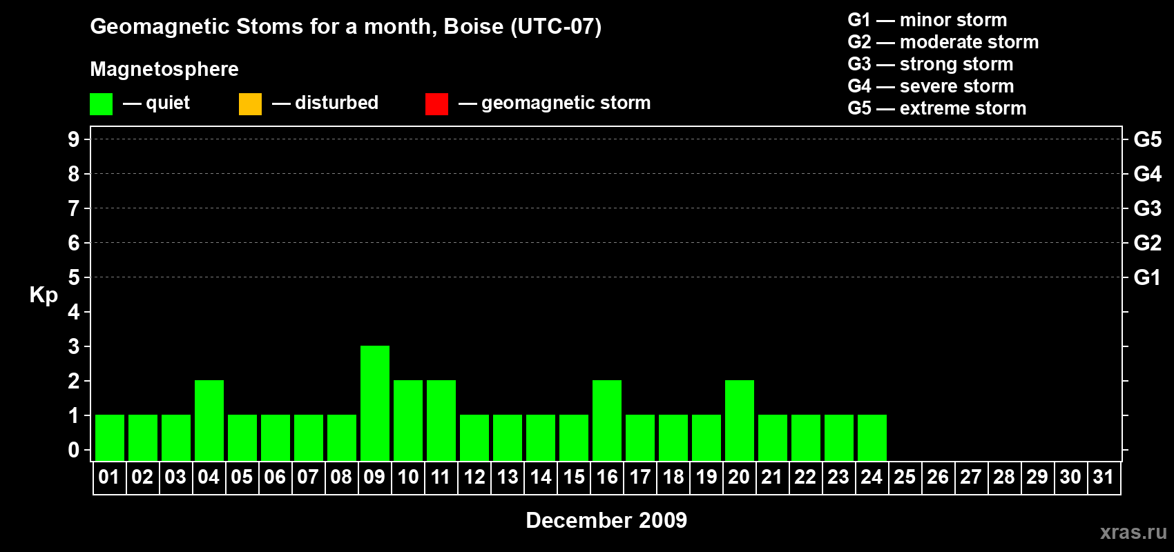 Changes in the geomagnetic index Kp from December 29 to 31, 2009 for mid latitudes