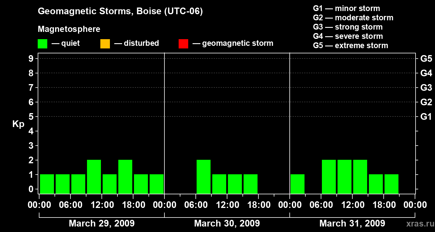 Changes in the geomagnetic index Kp from March 29 to 31, 2009 for mid latitudes