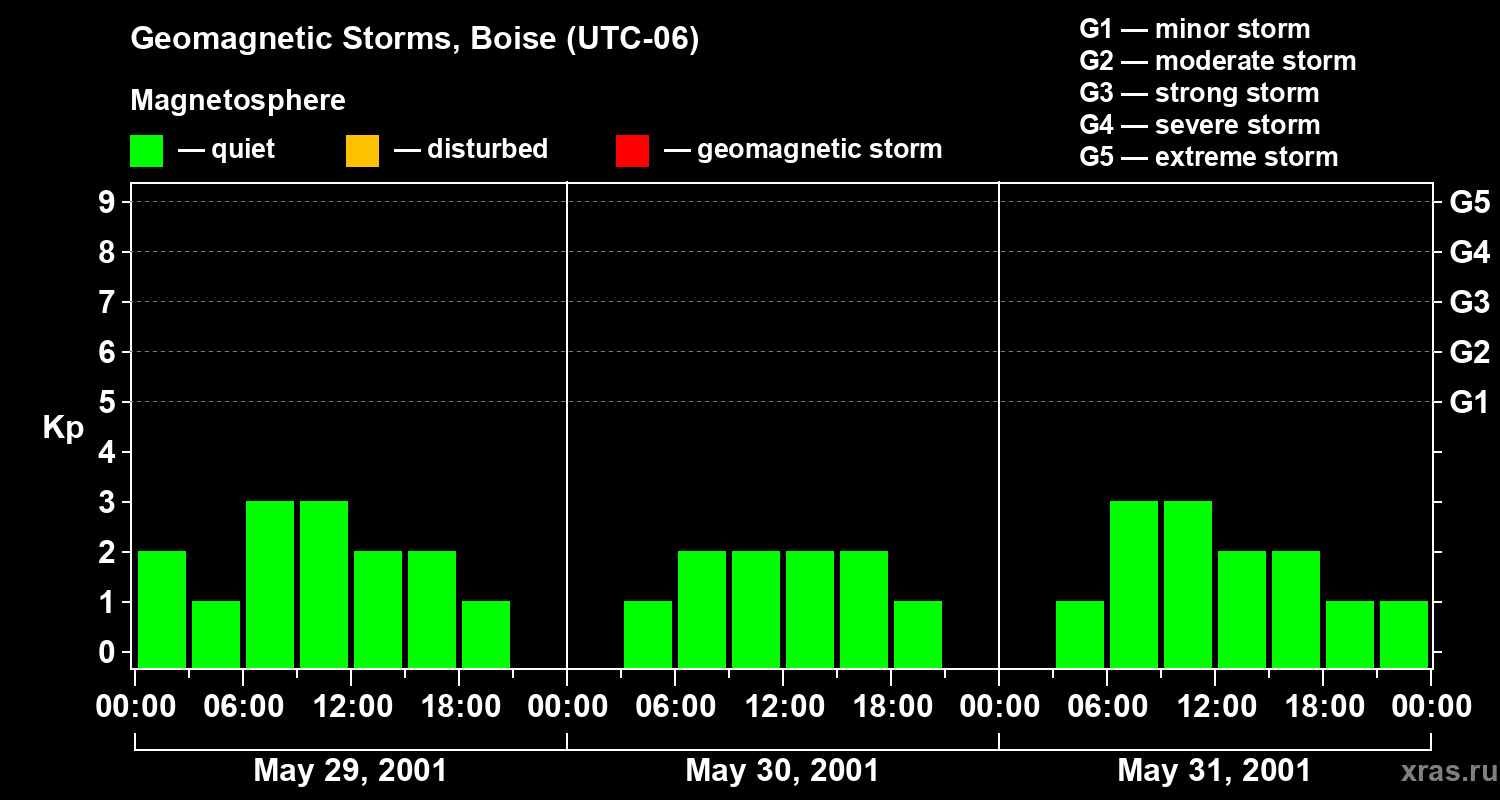 Changes in the geomagnetic index Kp from May 29 to 31, 2001 for mid latitudes