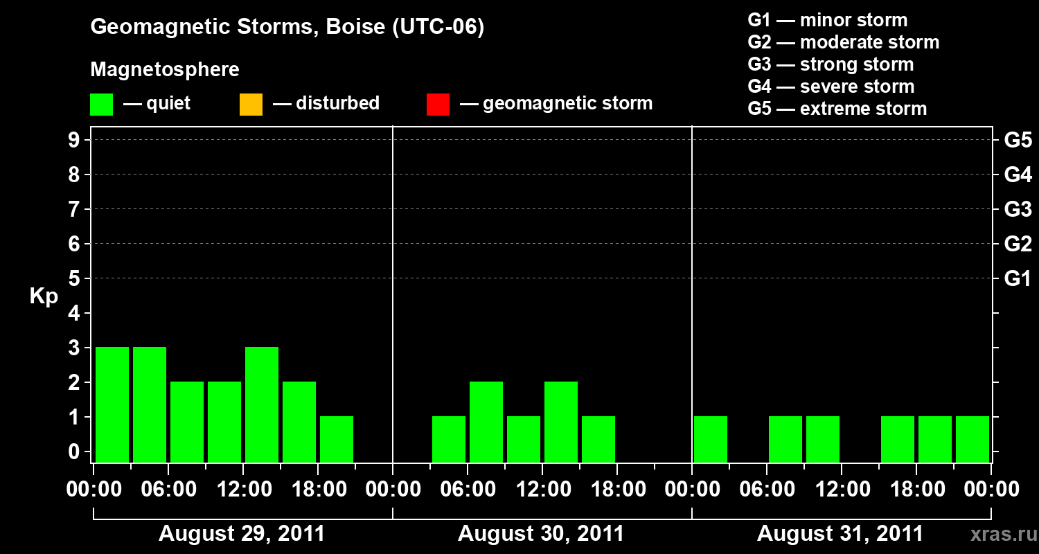 Changes in the geomagnetic index Kp from August 29 to 31, 2011 for mid latitudes