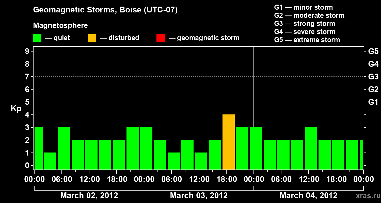 Changes in the geomagnetic index Kp from March 2 to 4, 2012 for mid latitudes