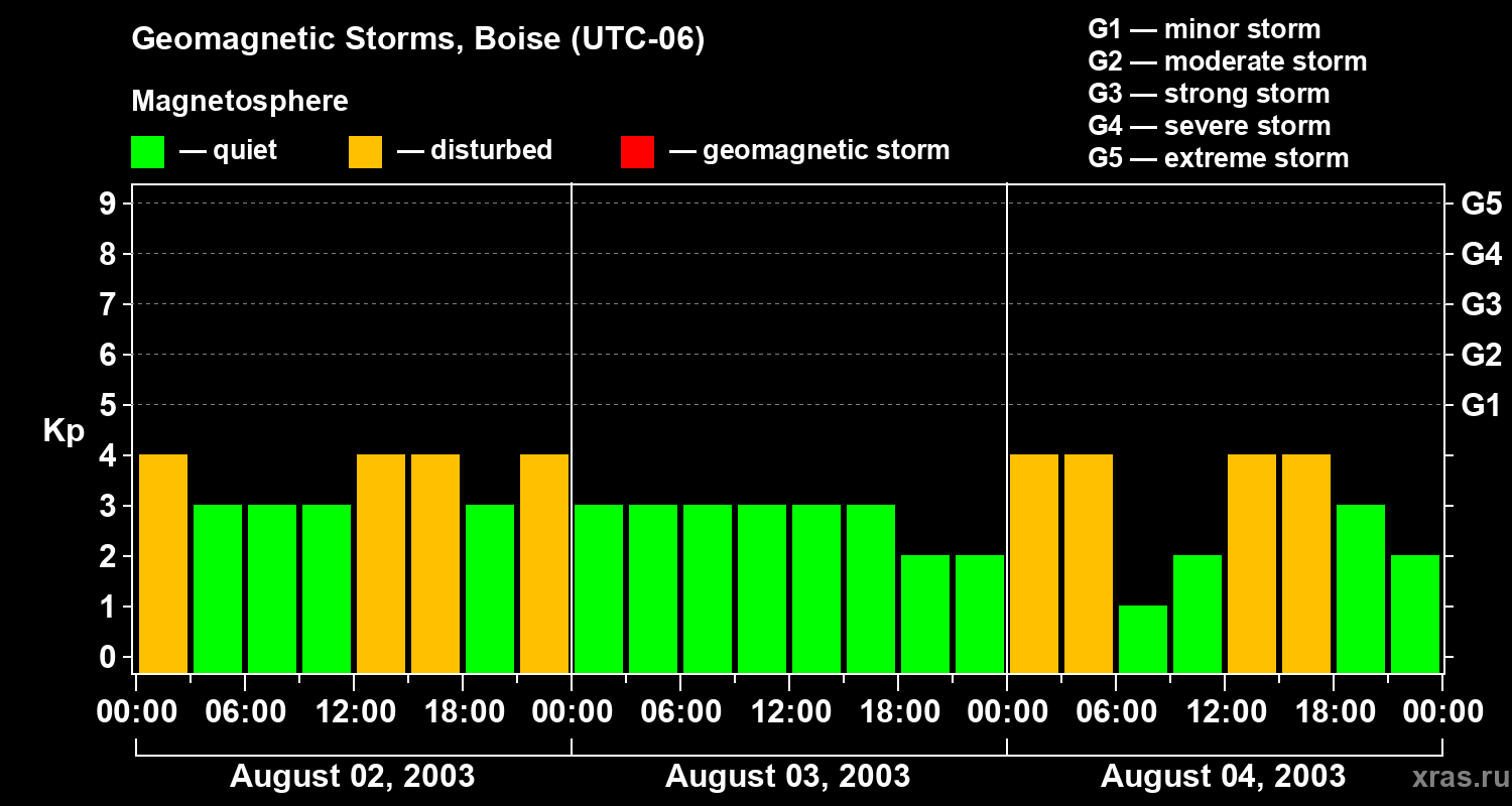 Changes in the geomagnetic index Kp from August 2 to 4, 2003 for mid latitudes