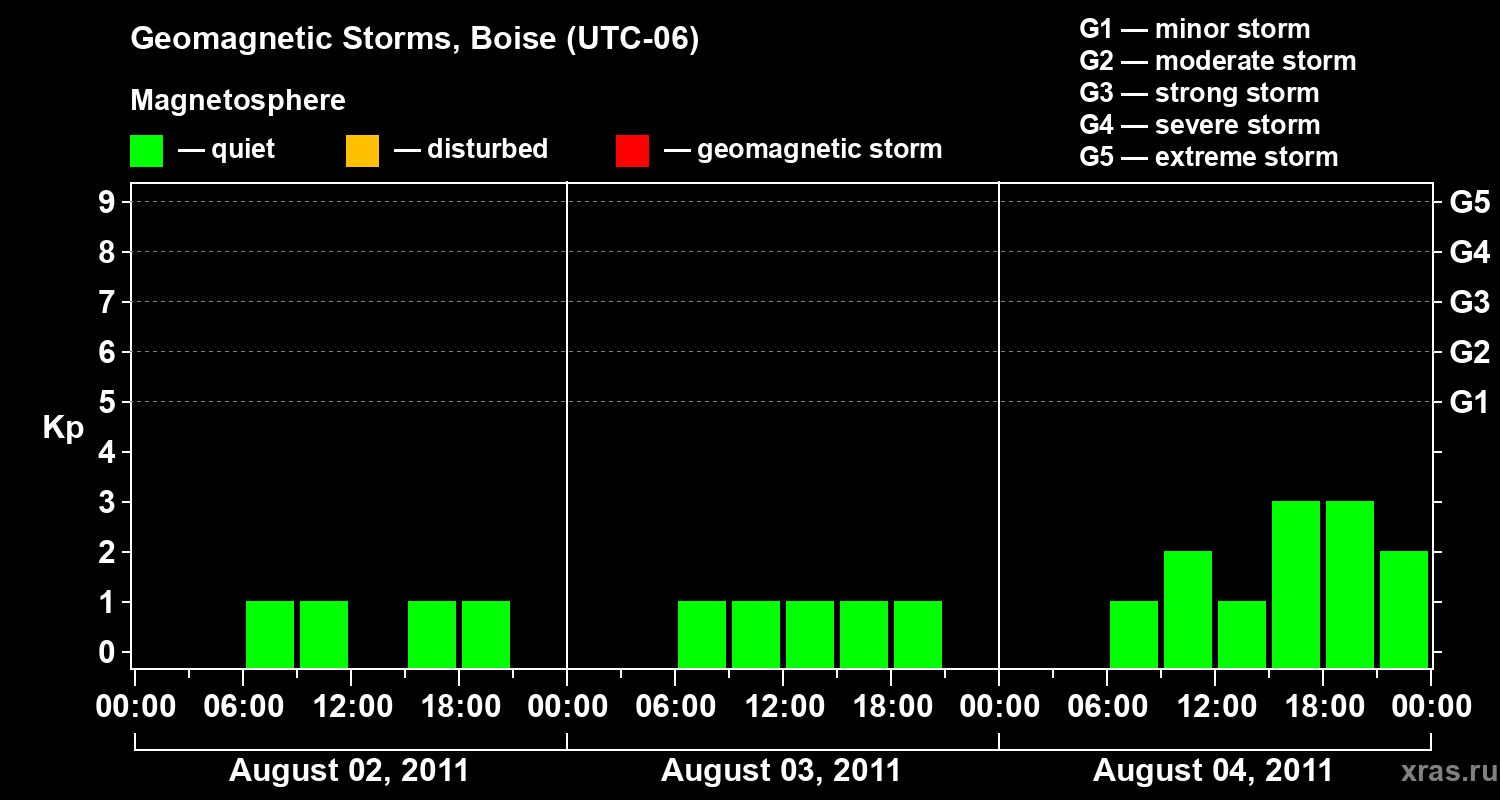 Changes in the geomagnetic index Kp from August 2 to 4, 2011 for mid latitudes