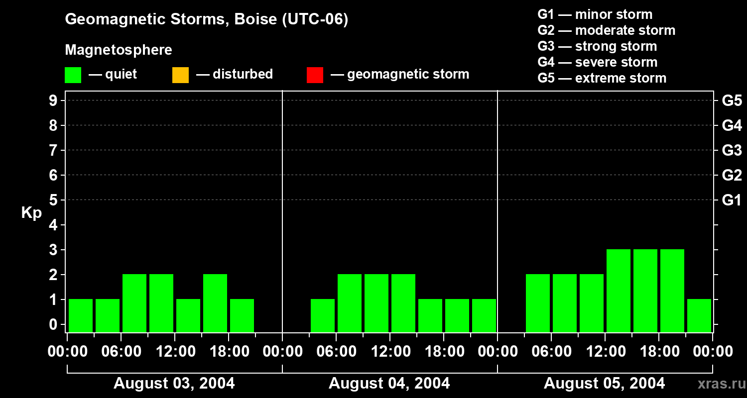 Changes in the geomagnetic index Kp from August 3 to 5, 2004 for mid latitudes