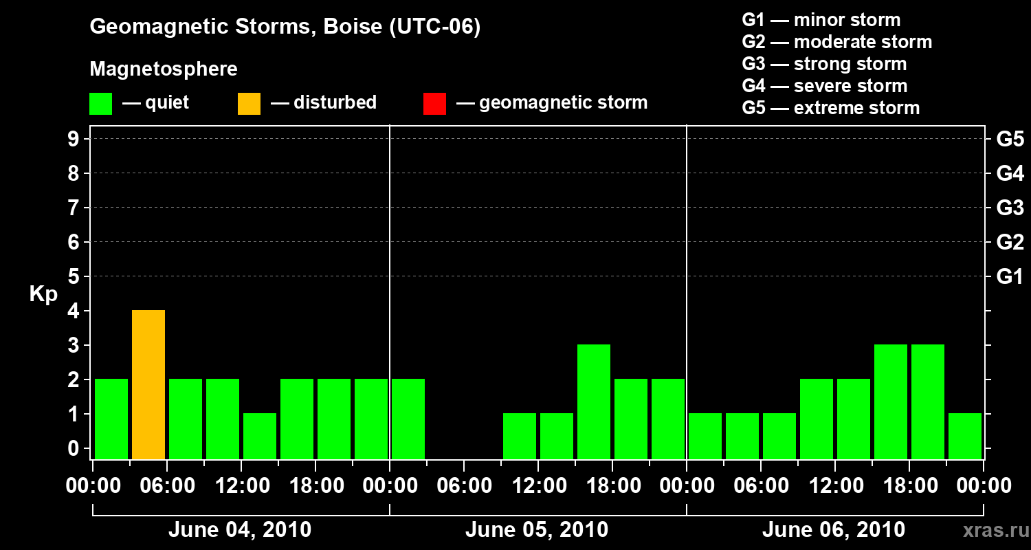 Changes in the geomagnetic index Kp from June 4 to 6, 2010 for mid latitudes