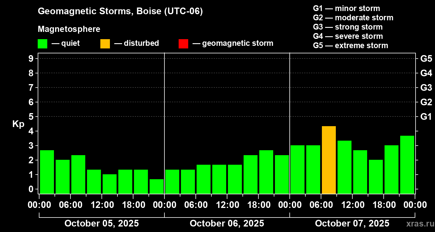 Changes in the geomagnetic index Kp from October 5 to 7, 2025 for mid latitudes