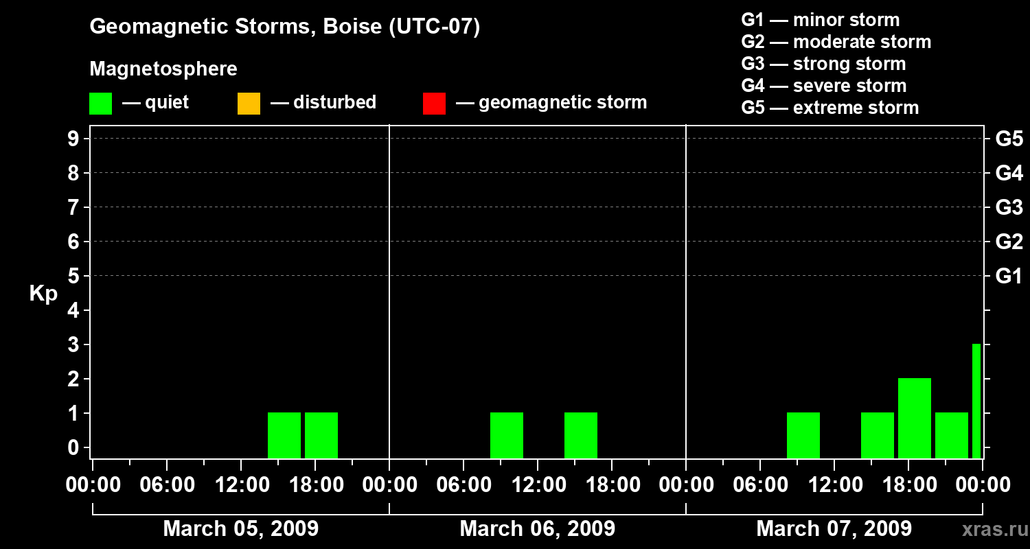 Changes in the geomagnetic index Kp from March 5 to 7, 2009 for mid latitudes