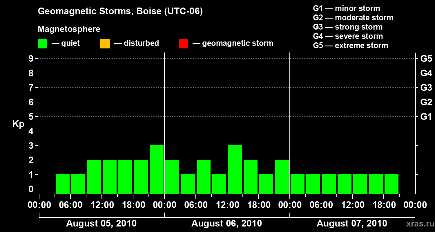 Changes in the geomagnetic index Kp from August 5 to 7, 2010 for mid latitudes