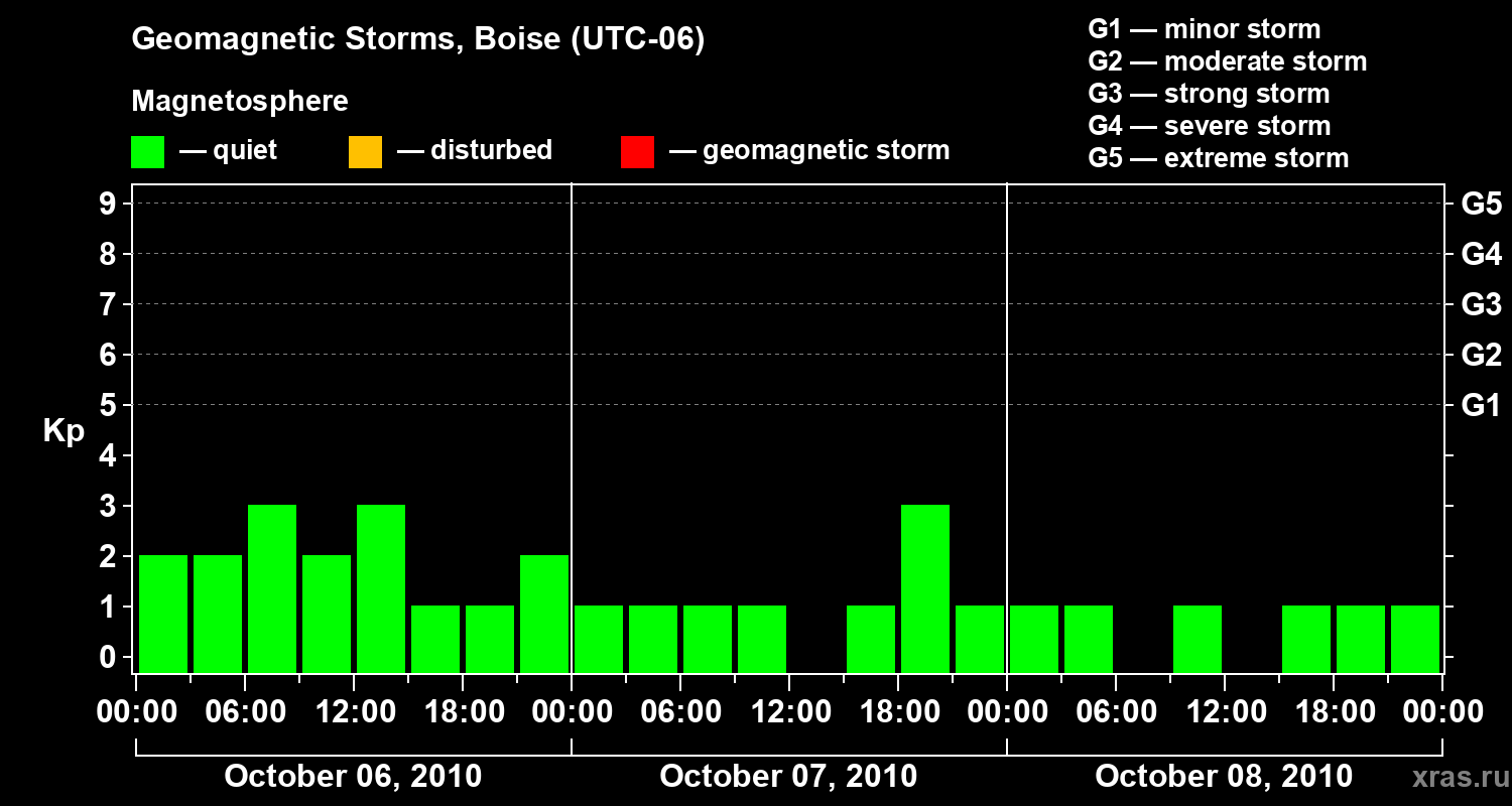 Changes in the geomagnetic index Kp from October 6 to 8, 2010 for mid latitudes