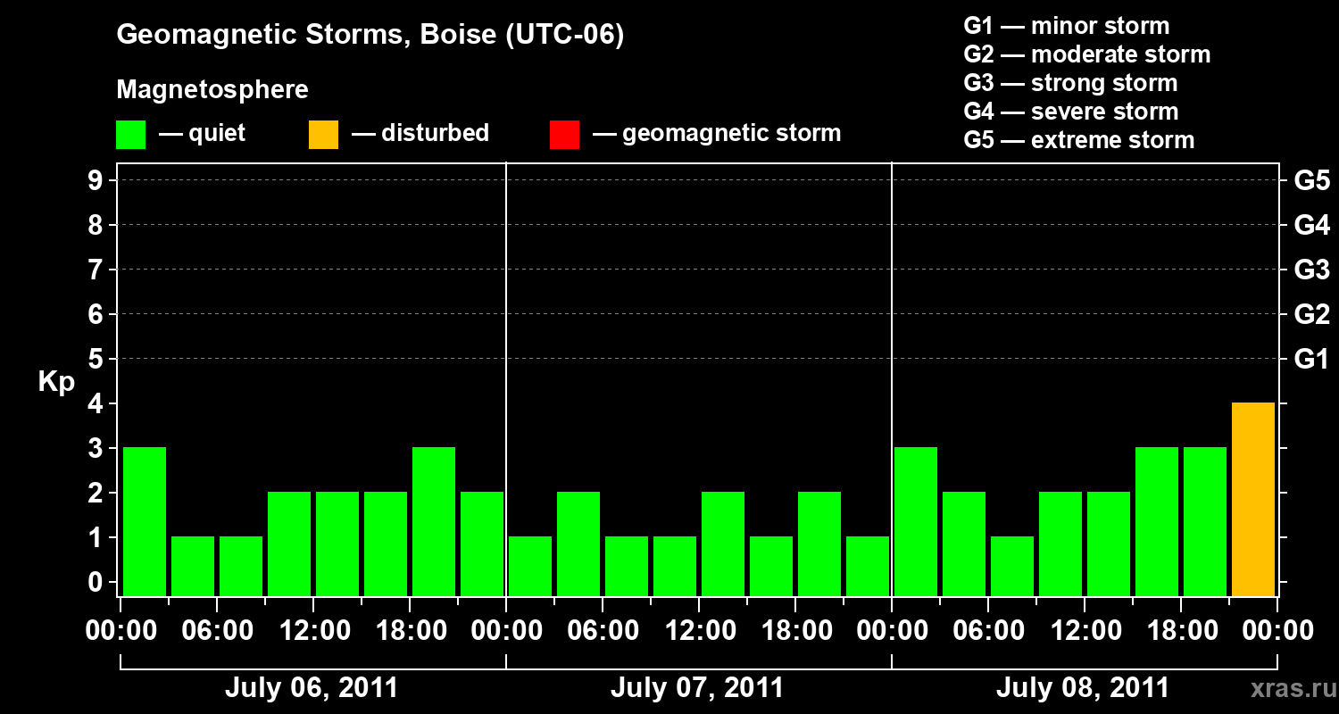 Changes in the geomagnetic index Kp from July 6 to 8, 2011 for mid latitudes