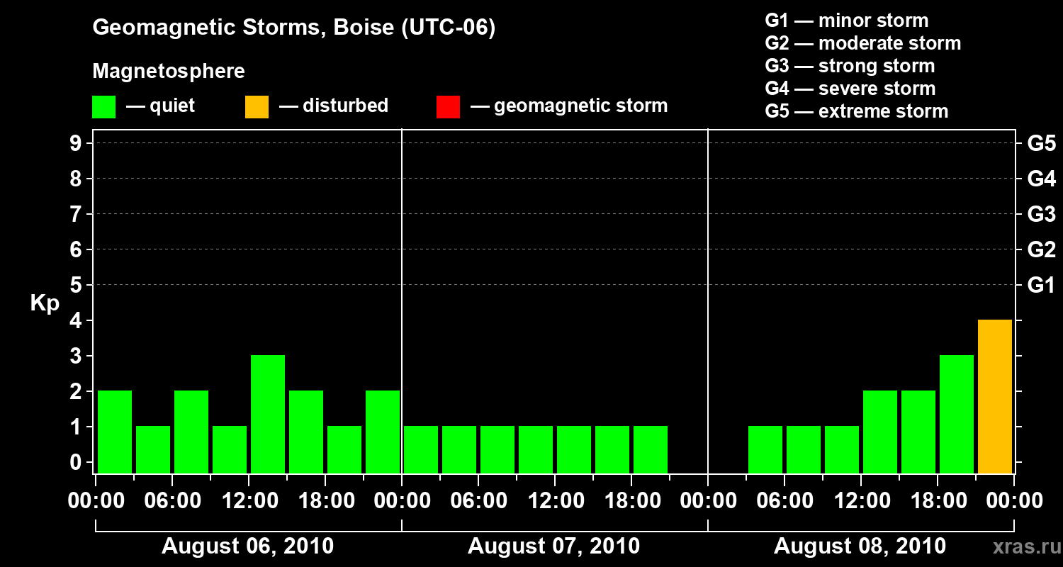 Changes in the geomagnetic index Kp from August 6 to 8, 2010 for mid latitudes
