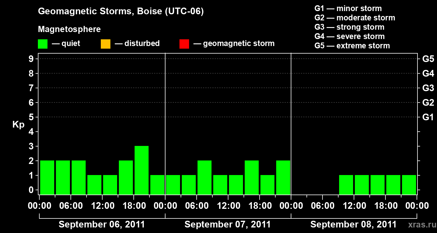 Changes in the geomagnetic index Kp from September 6 to 8, 2011 for mid latitudes