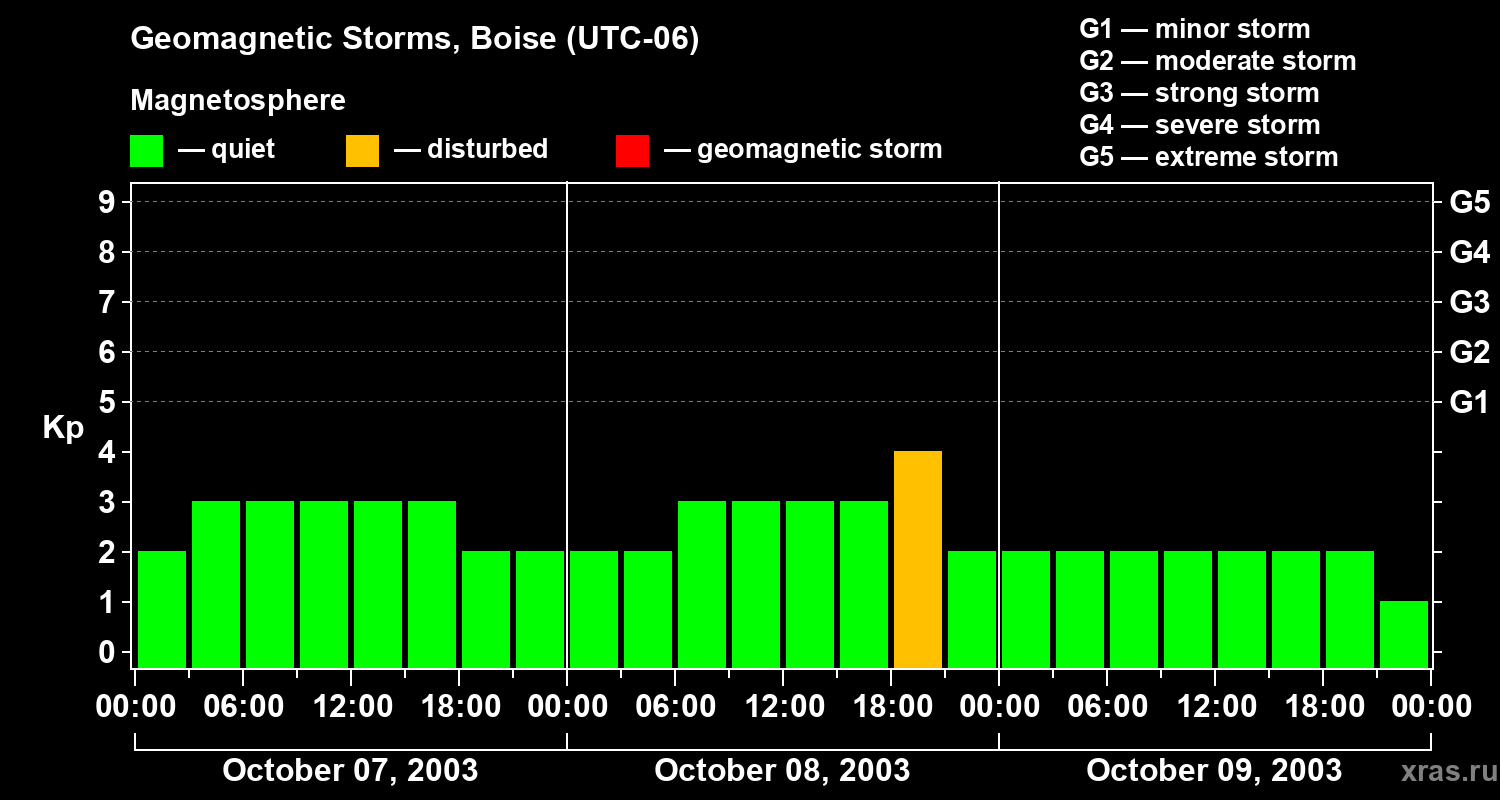 Changes in the geomagnetic index Kp from October 7 to 9, 2003 for mid latitudes