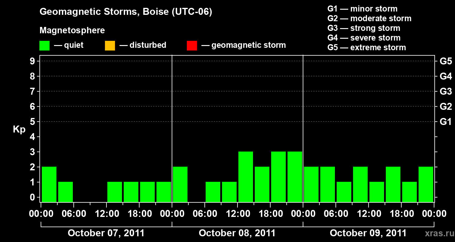 Changes in the geomagnetic index Kp from October 7 to 9, 2011 for mid latitudes