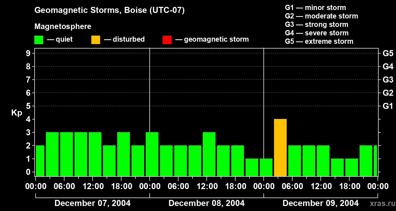 Changes in the geomagnetic index Kp from December 7 to 9, 2004 for mid latitudes