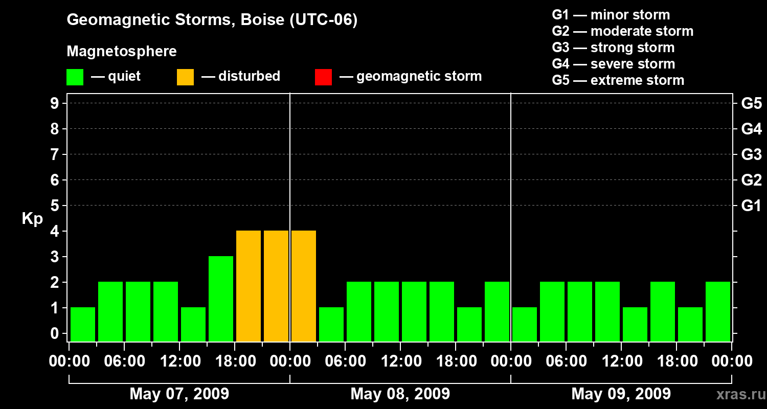 Changes in the geomagnetic index Kp from May 7 to 9, 2009 for mid latitudes