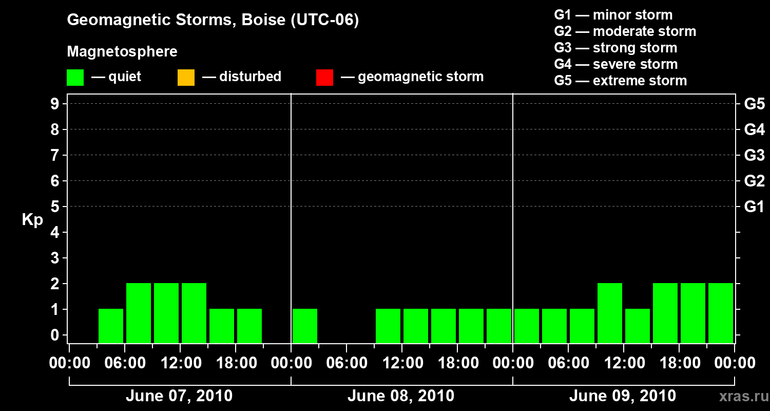 Changes in the geomagnetic index Kp from June 7 to 9, 2010 for mid latitudes
