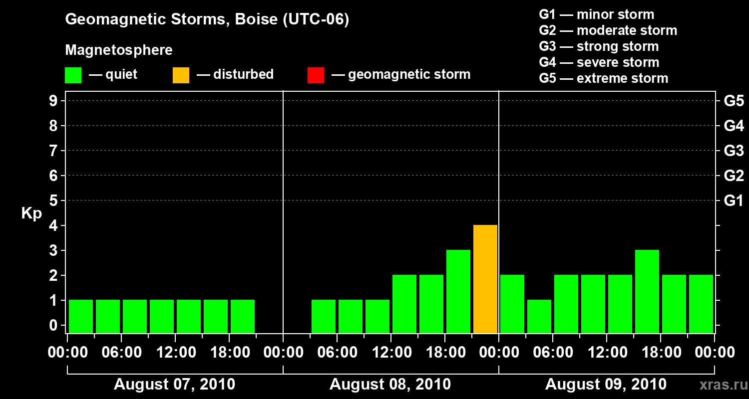 Changes in the geomagnetic index Kp from August 7 to 9, 2010 for mid latitudes