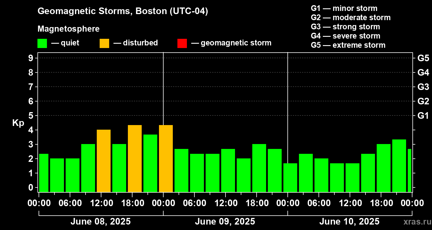 Changes in the geomagnetic index Kp from June 8 to 10, 2025 for mid latitudes