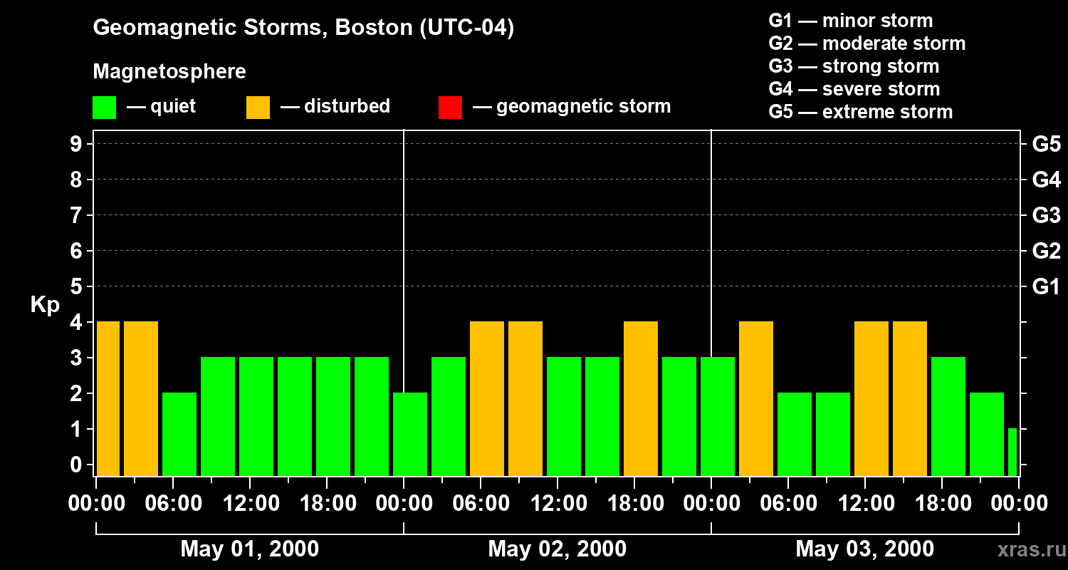 Changes in the geomagnetic index Kp from May 1 to 3, 2000 for mid latitudes
