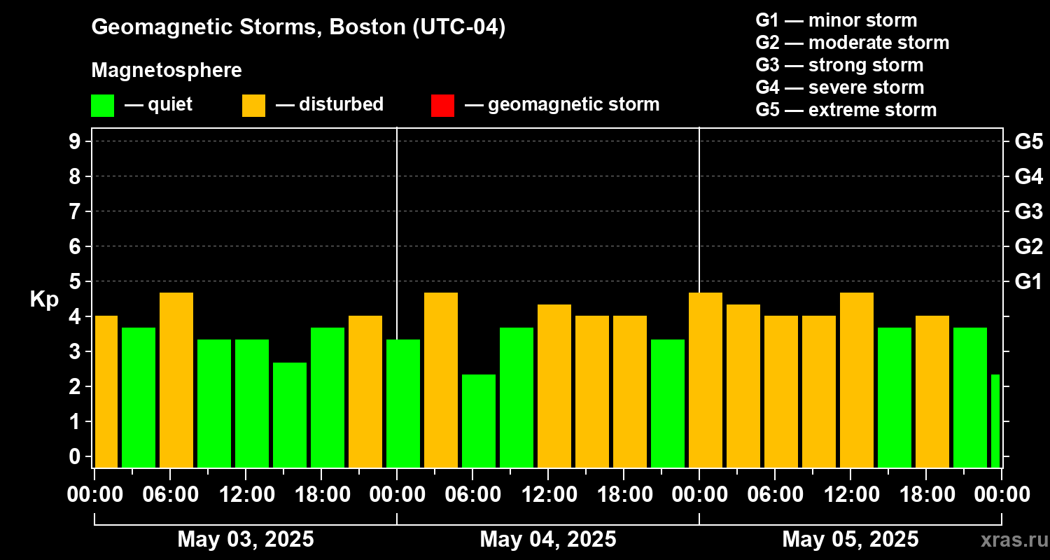 Changes in the geomagnetic index Kp from May 3 to 5, 2025 for mid latitudes