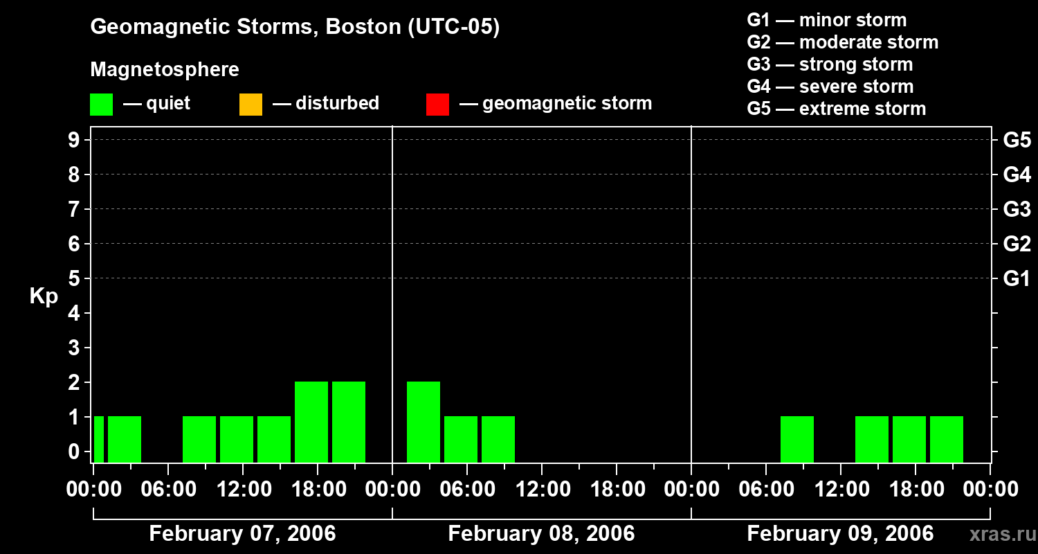 Changes in the geomagnetic index Kp from February 7 to 9, 2006 for mid latitudes