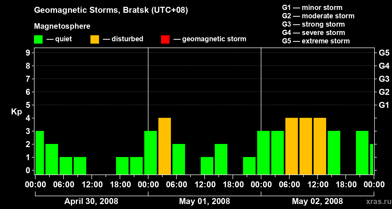 Changes in the geomagnetic index Kp from April 30 to May 2, 2008 for mid latitudes