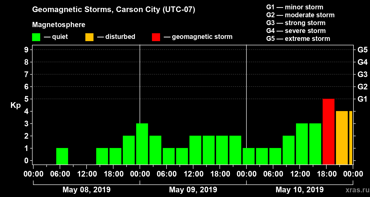 Changes in the geomagnetic index Kp from May 8 to 10, 2019 for mid latitudes