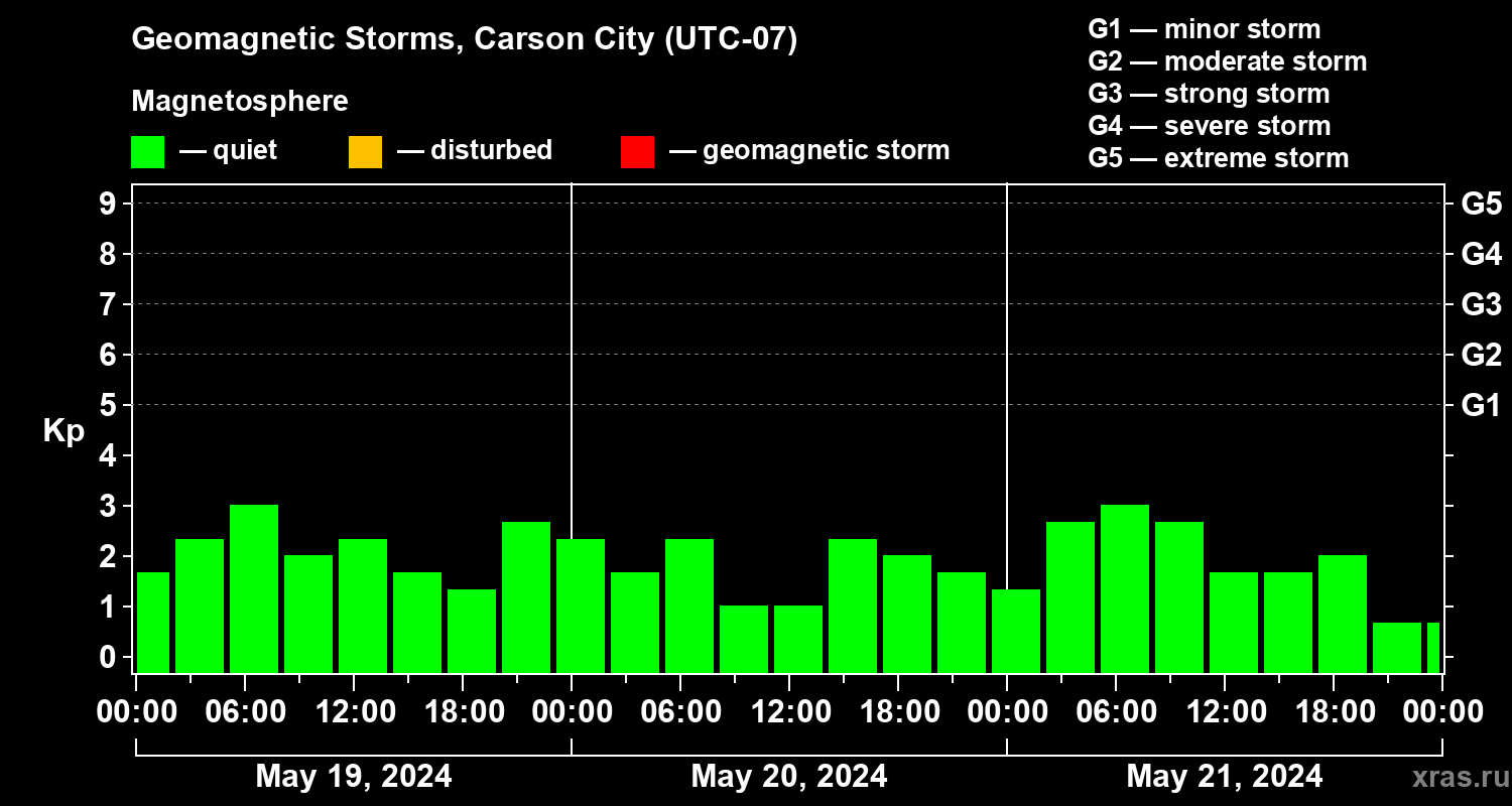 Changes in the geomagnetic index Kp from May 19 to 21, 2024 for mid latitudes