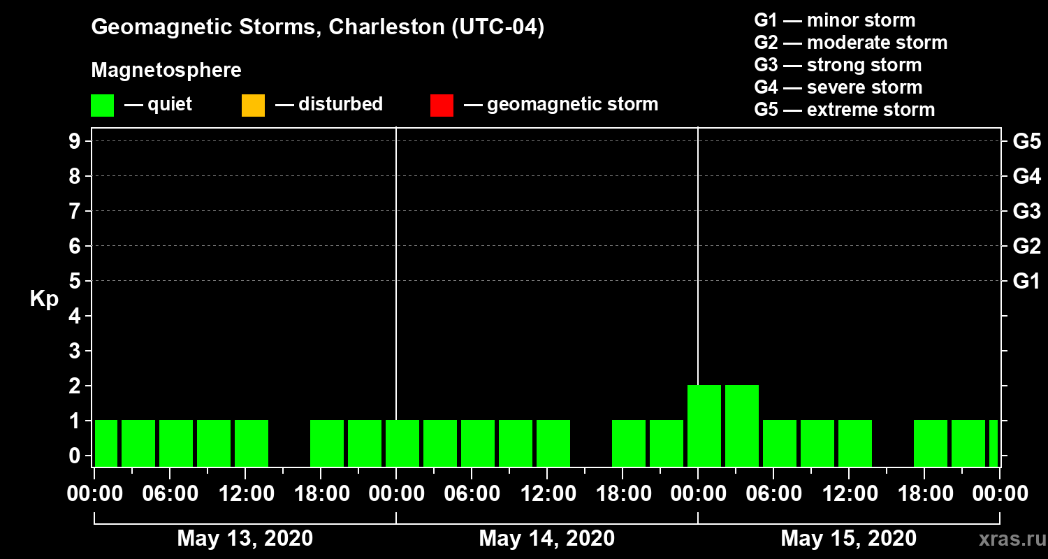 Changes in the geomagnetic index Kp from May 13 to 15, 2020 for mid latitudes