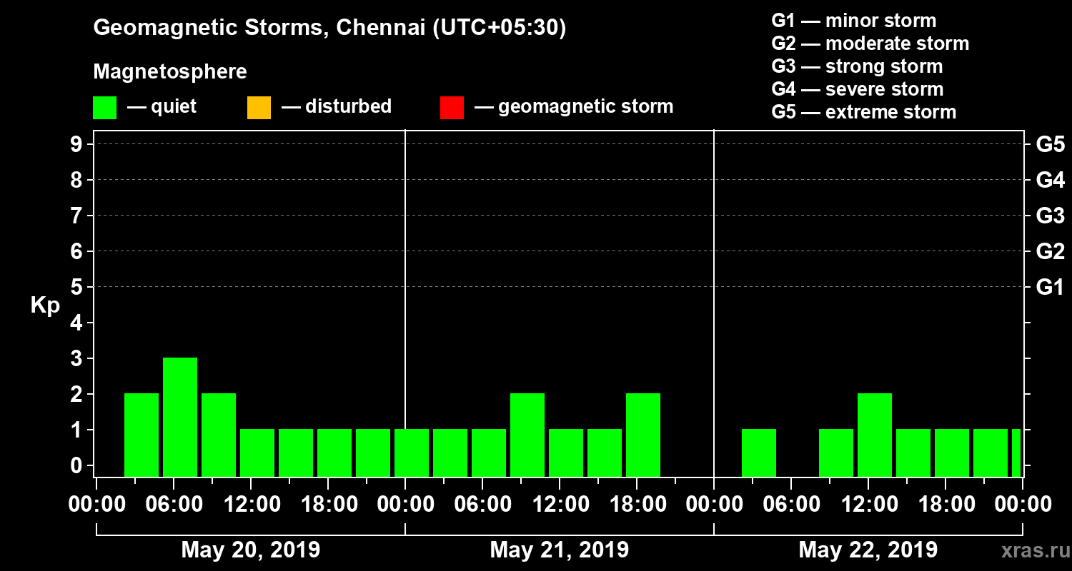 Changes in the geomagnetic index Kp from May 20 to 22, 2019 for mid latitudes
