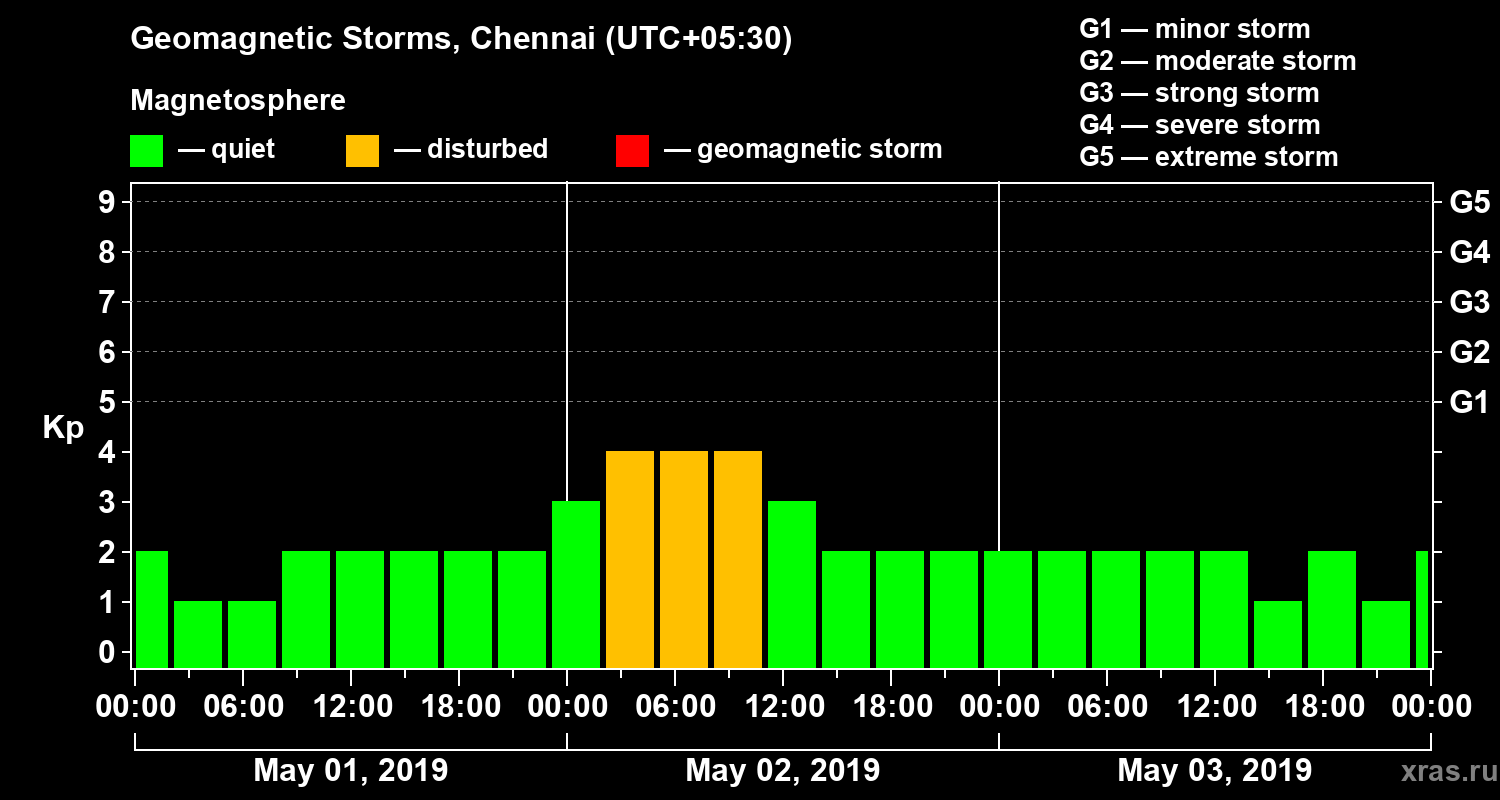 Changes in the geomagnetic index Kp from May 1 to 3, 2019 for mid latitudes