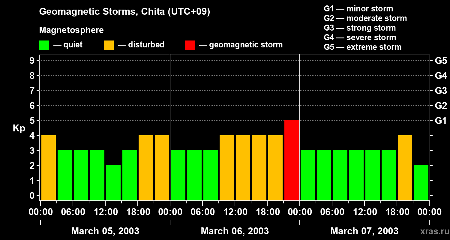 Changes in the geomagnetic index Kp from March 5 to 7, 2003 for mid latitudes