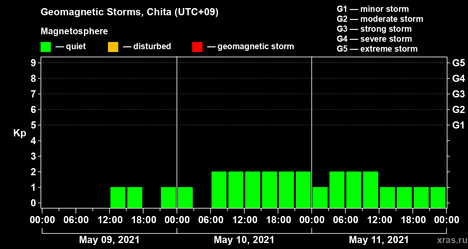 Changes in the geomagnetic index Kp from May 9 to 11, 2021 for mid latitudes