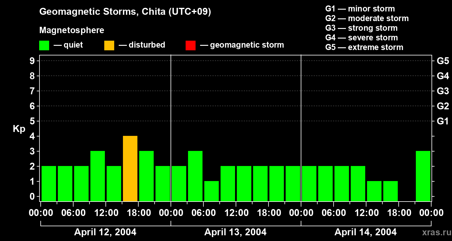 Changes in the geomagnetic index Kp from April 12 to 14, 2004 for mid latitudes