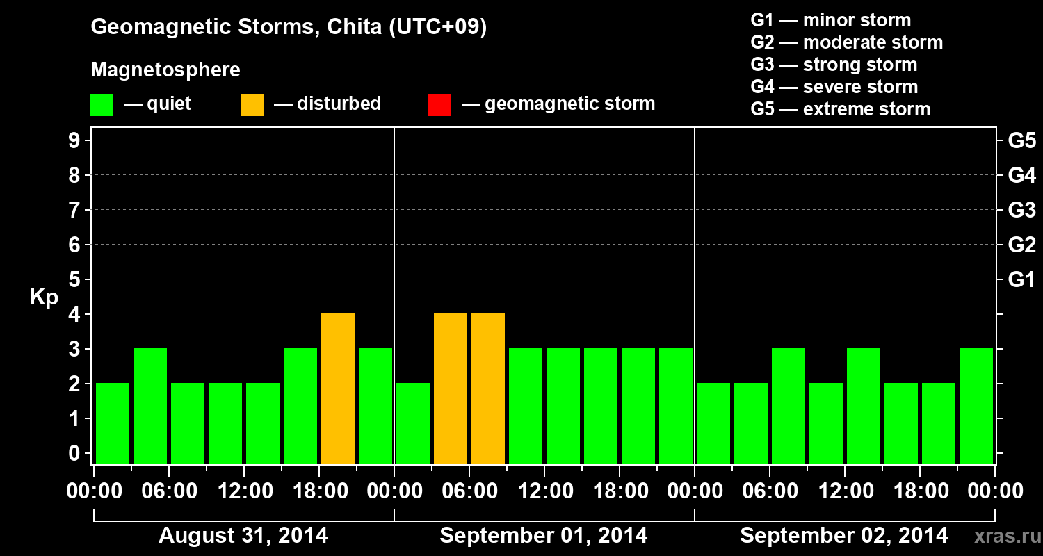 Changes in the geomagnetic index Kp from August 31 to September 2, 2014 for mid latitudes