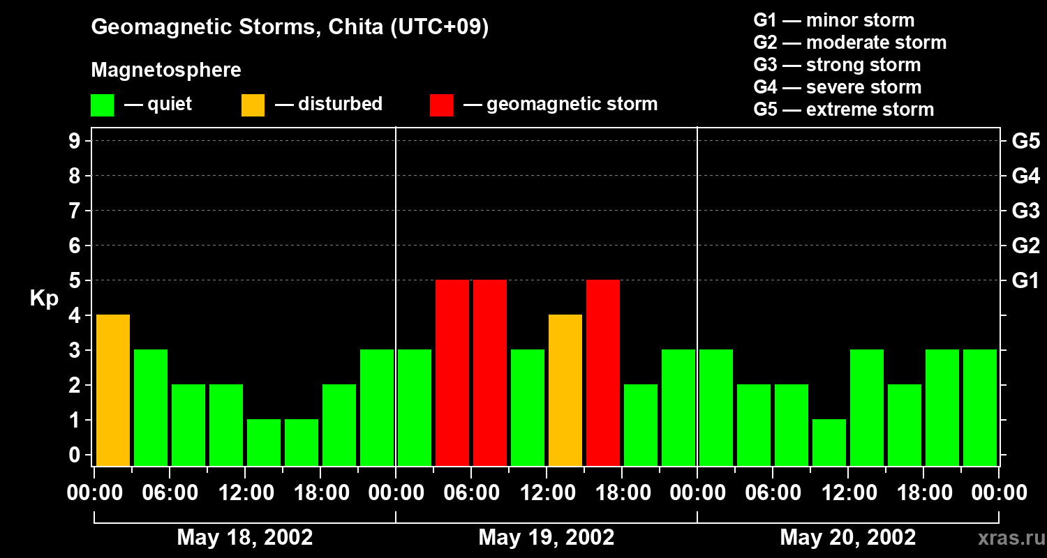 Changes in the geomagnetic index Kp from May 18 to 20, 2002 for mid latitudes