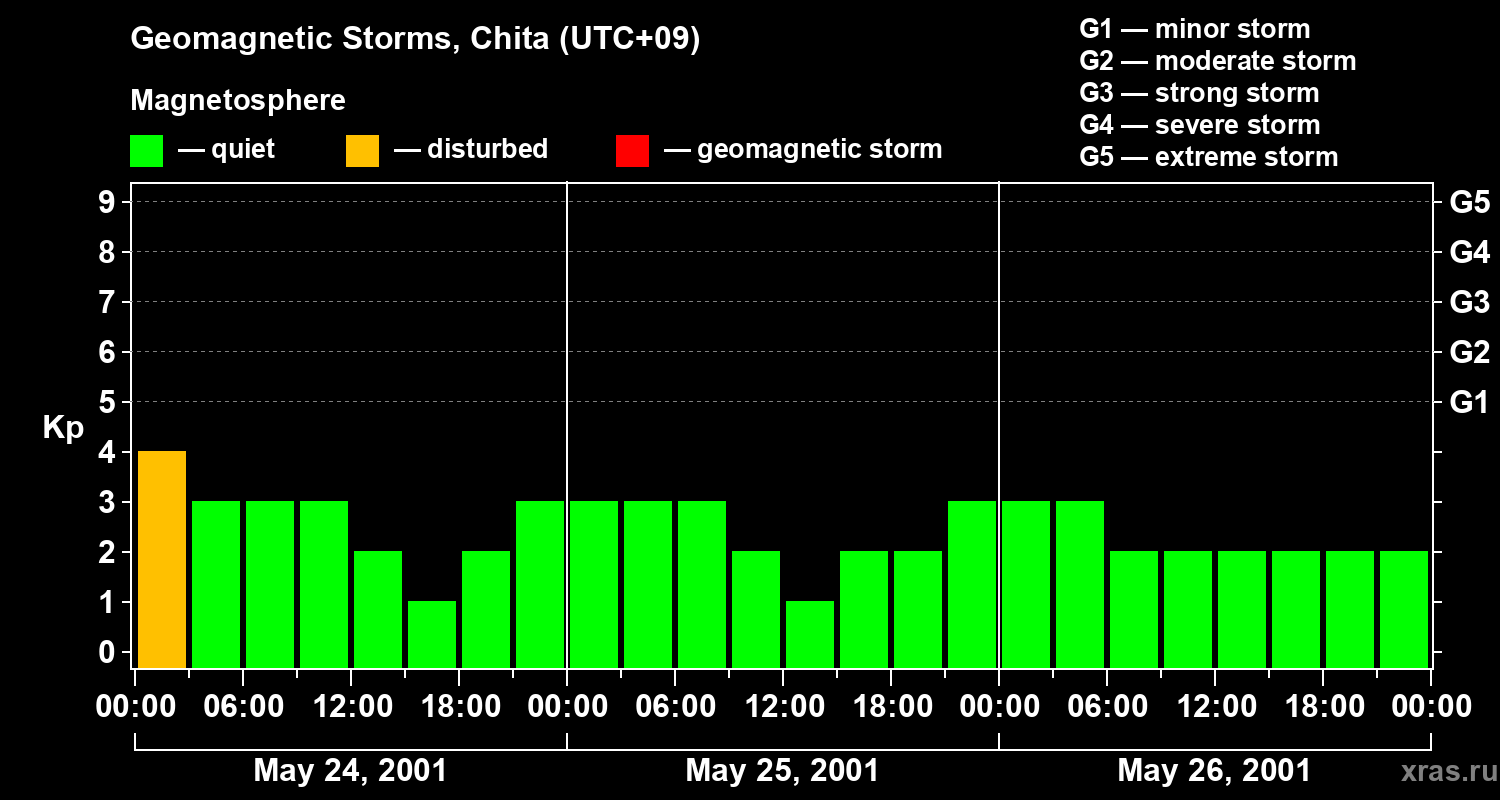 Changes in the geomagnetic index Kp from May 24 to 26, 2001 for mid latitudes