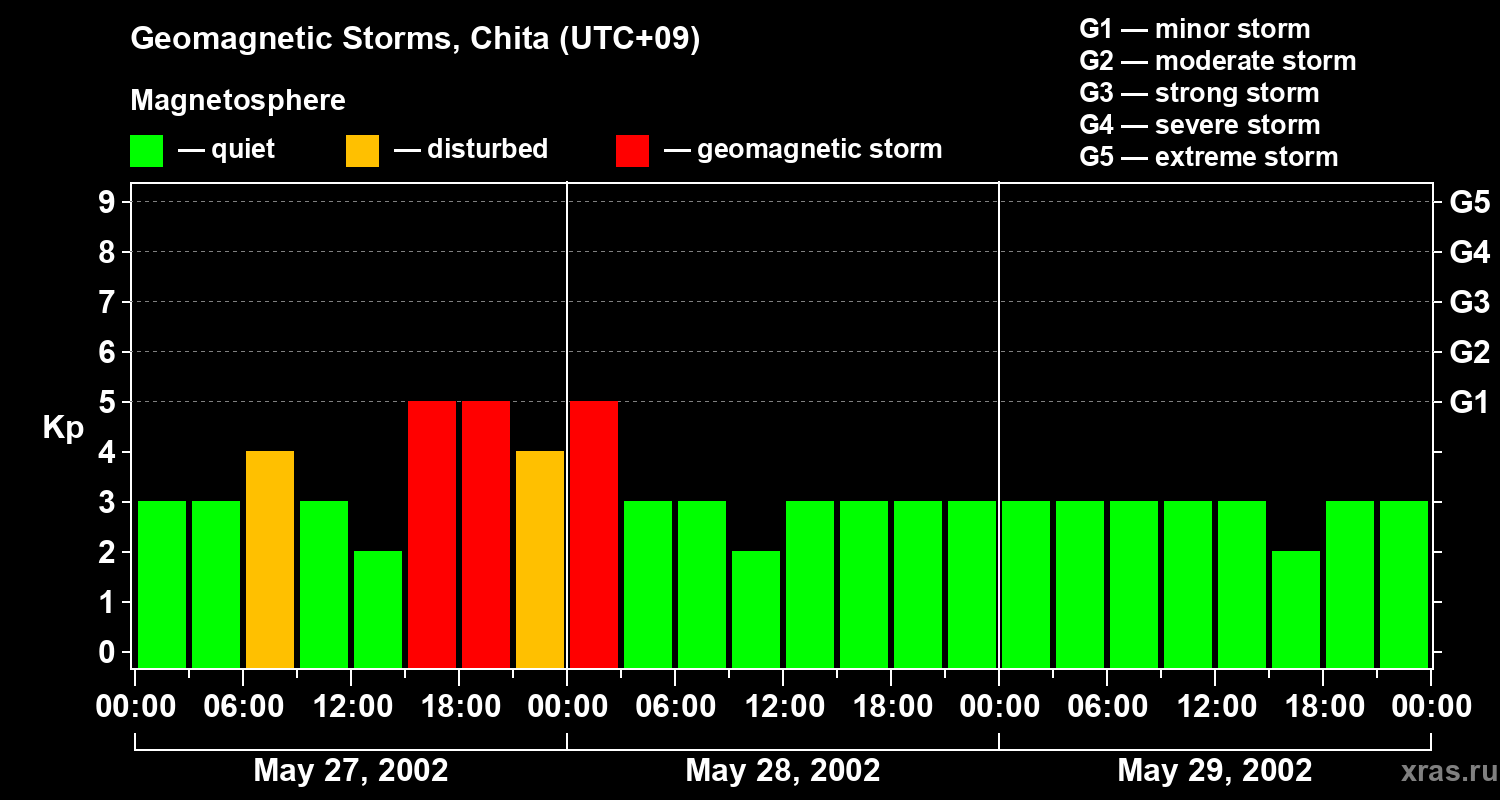Changes in the geomagnetic index Kp from May 27 to 29, 2002 for mid latitudes