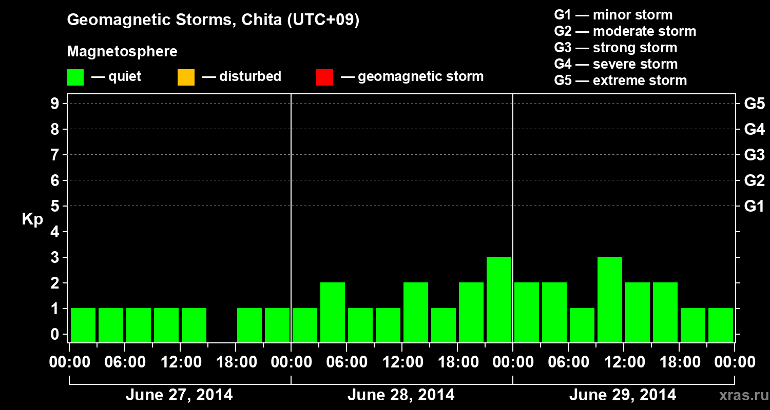 Changes in the geomagnetic index Kp from June 27 to 29, 2014 for mid latitudes