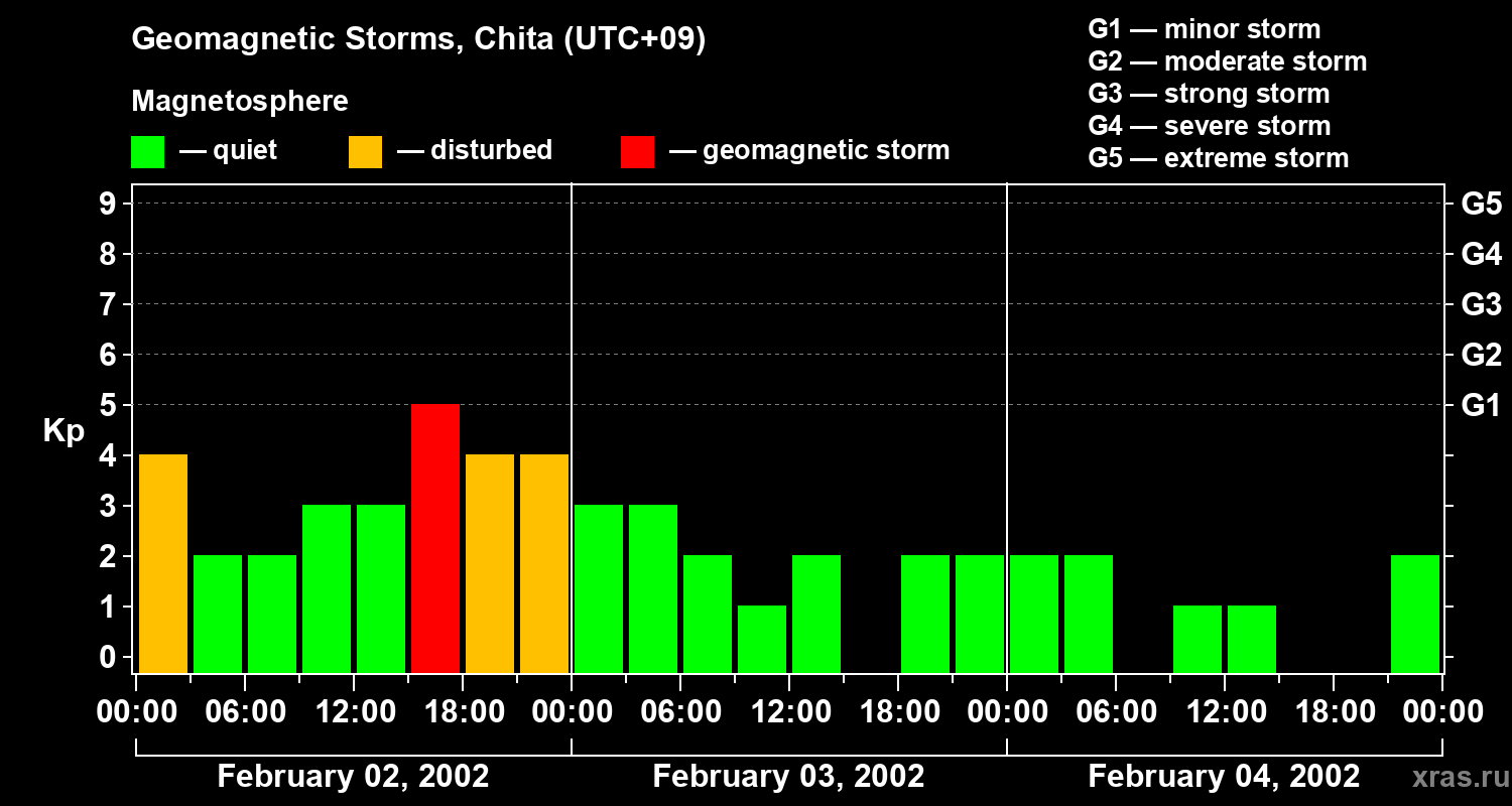 Changes in the geomagnetic index Kp from February 2 to 4, 2002 for mid latitudes