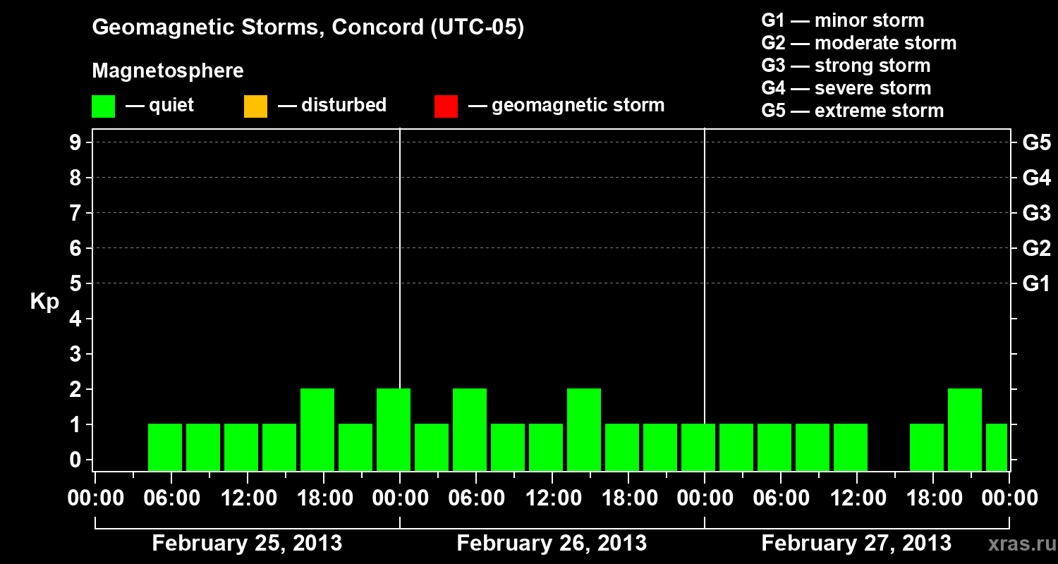 Changes in the geomagnetic index Kp from February 25 to 27, 2013 for mid latitudes