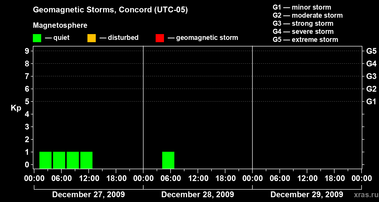 Changes in the geomagnetic index Kp from December 27 to 29, 2009 for mid latitudes