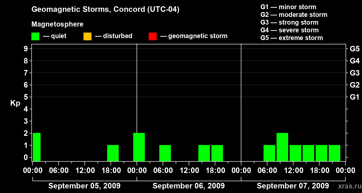 Changes in the geomagnetic index Kp from September 5 to 7, 2009 for mid latitudes