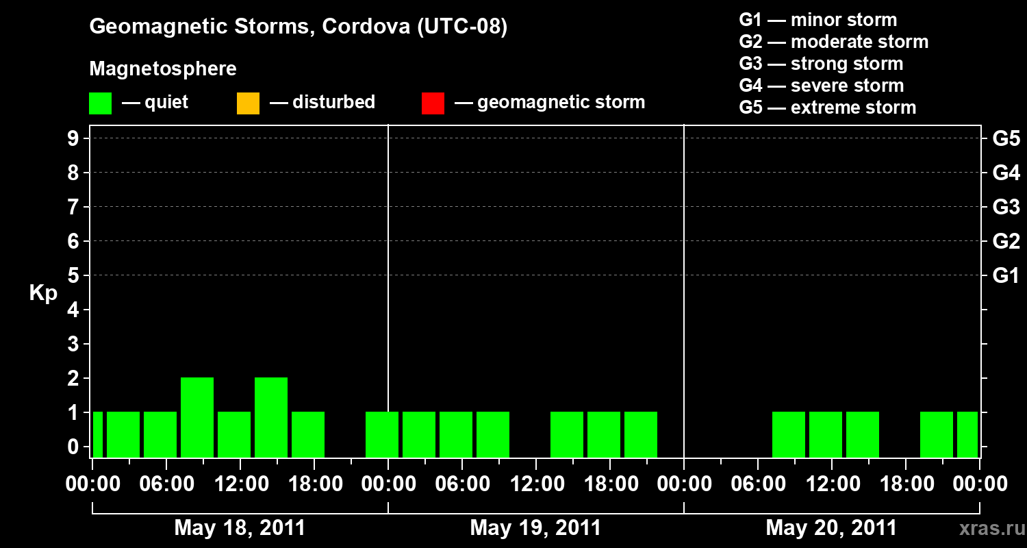 Changes in the geomagnetic index Kp from May 18 to 20, 2011 for mid latitudes