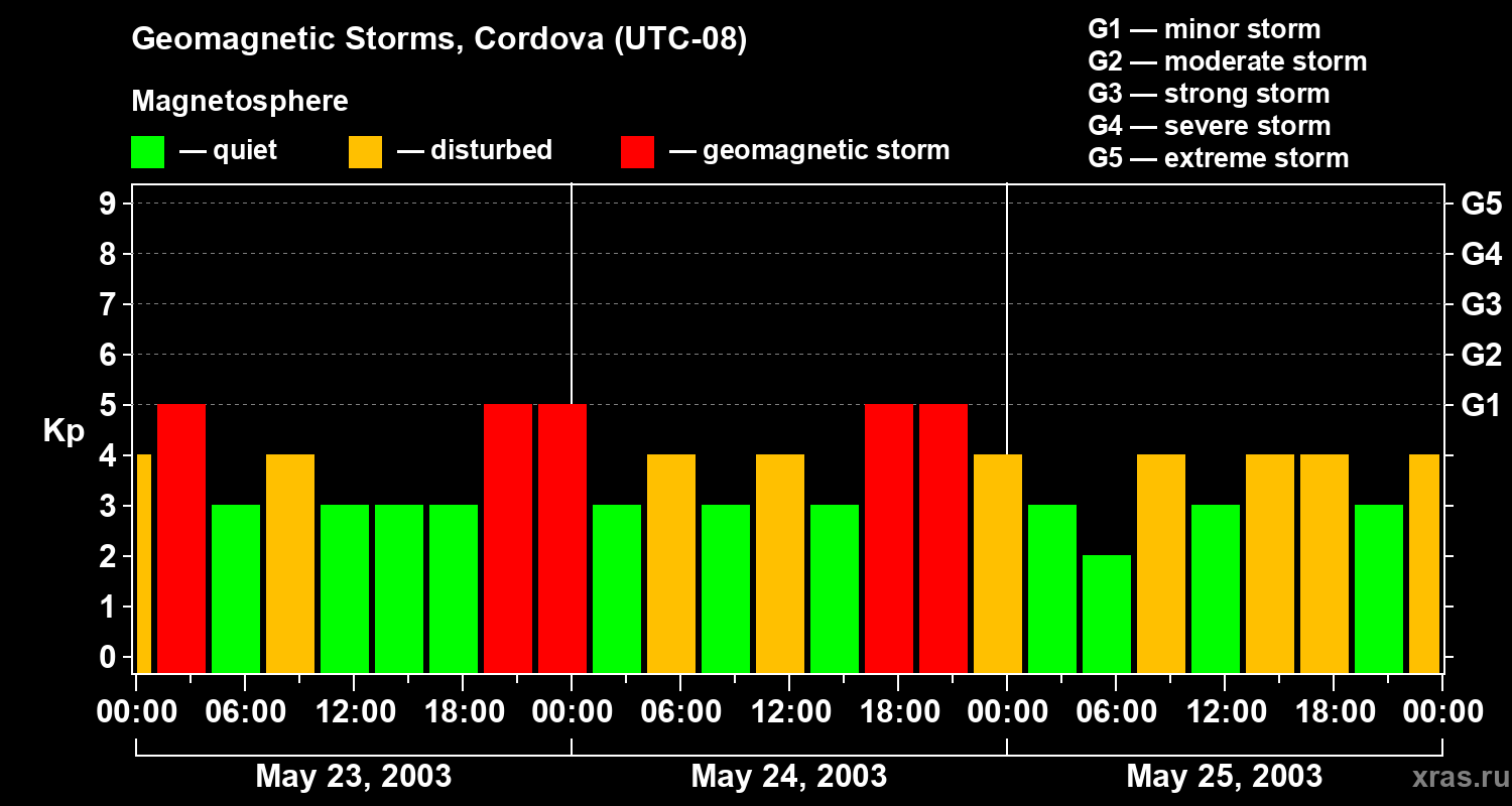 Changes in the geomagnetic index Kp from May 23 to 25, 2003 for mid latitudes