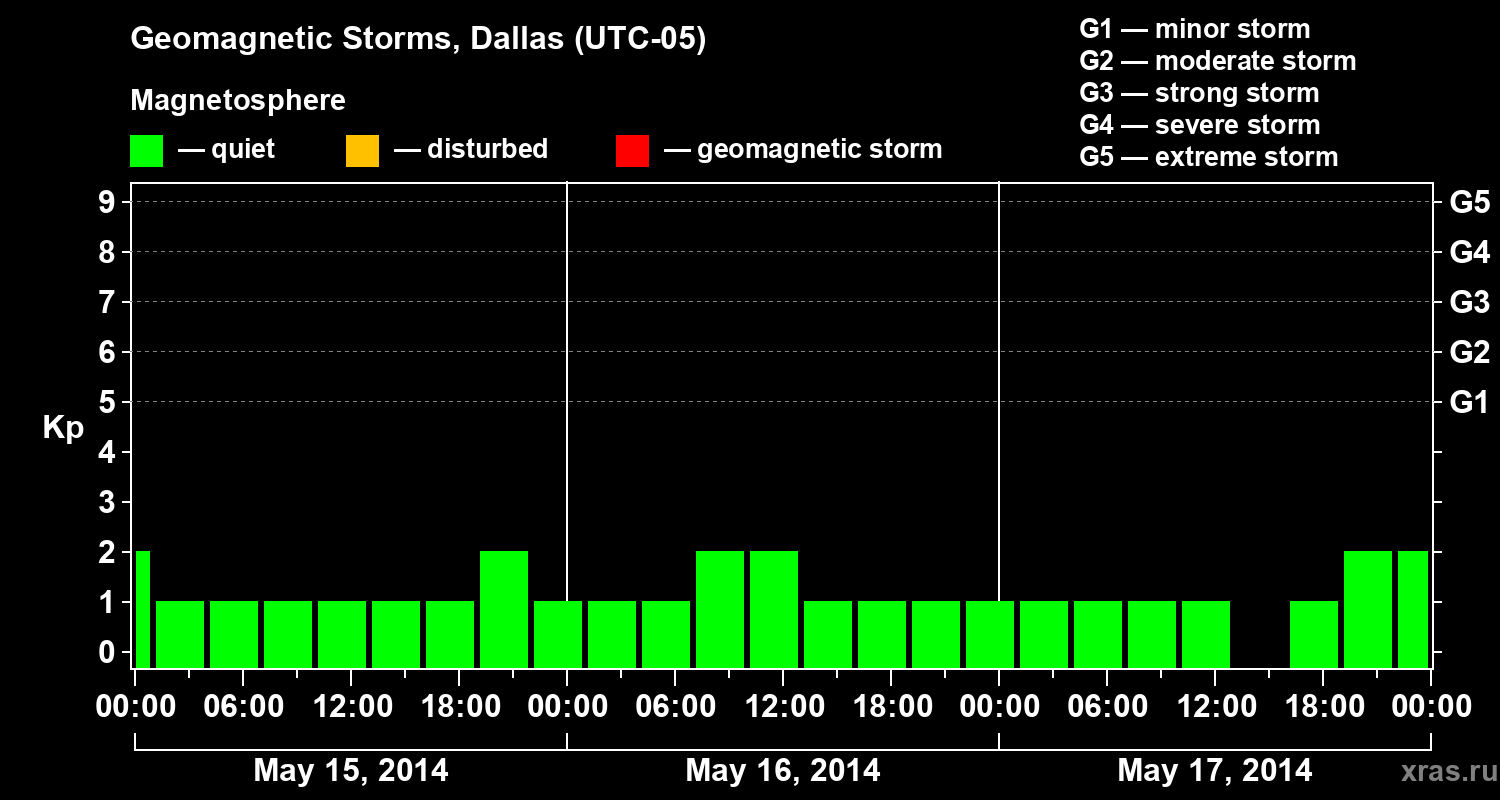 Changes in the geomagnetic index Kp from May 15 to 17, 2014 for mid latitudes