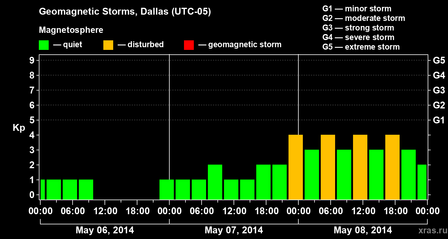 Changes in the geomagnetic index Kp from May 6 to 8, 2014 for mid latitudes