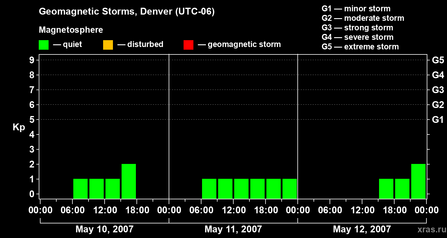 Changes in the geomagnetic index Kp from May 10 to 12, 2007 for mid latitudes